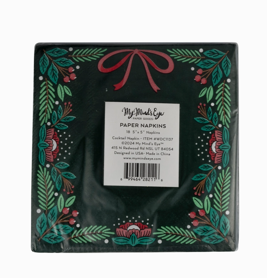 Spread some holiday cheer and keep your guests merry with this Eat Drink & Be Merry cocktail napkin. This festive rich colored emerald green napkin features a playful "eat drink & be merry" gold foil design & classic red bow that's perfect for Christmas parties.